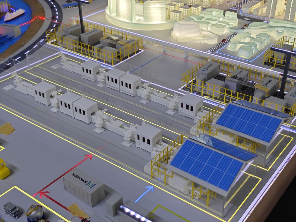 Using the aviation-grade Aklik plate as the base, the terrain profile of the 1:200 scale was formed by laser cutting. The slopes are partially carved manually using bubble PU materials to shape natural ups and downs with a plaster mixture, with a surface covered with mineral powder and white emulsions. Aluminium alloy-type CNC is used for processing at the bottom of the PV array to ensure that the angle of each PV installation is fully consistent with that of the live power station and that the error is within ±0.5°.